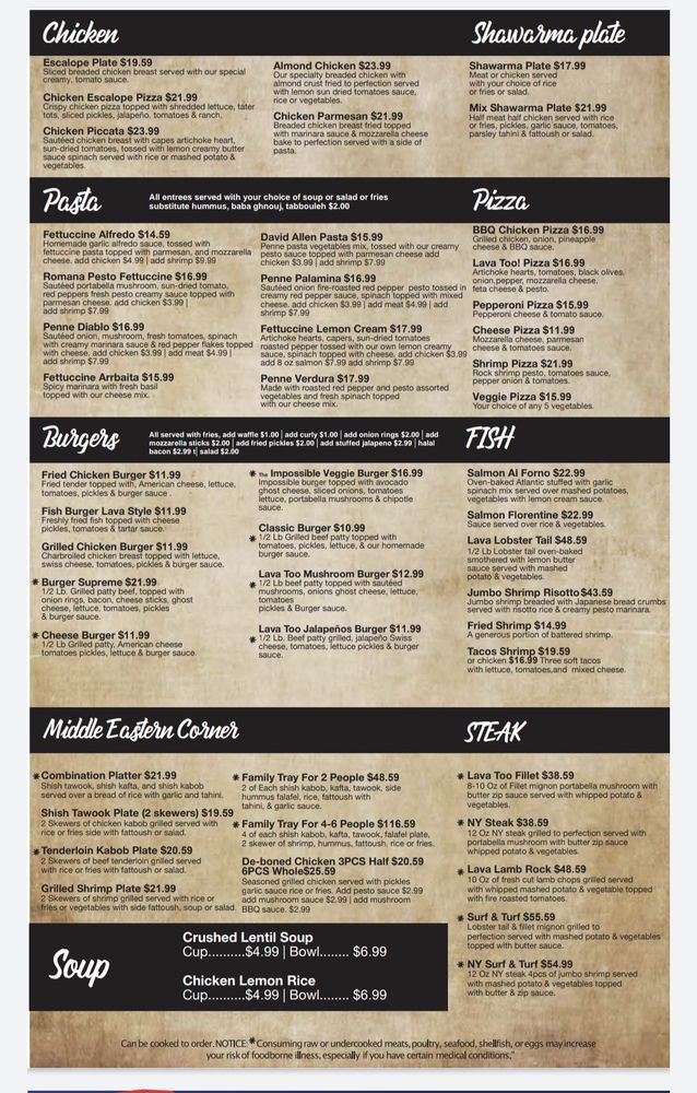 While service can vary, the owners are known for their commitment to ensuring customer satisfaction and fostering a welcoming atmosphere. With amenities like outdoor dining and delivery available, The Lava Lounge Too strives to accommodate diverse preferences and needs.